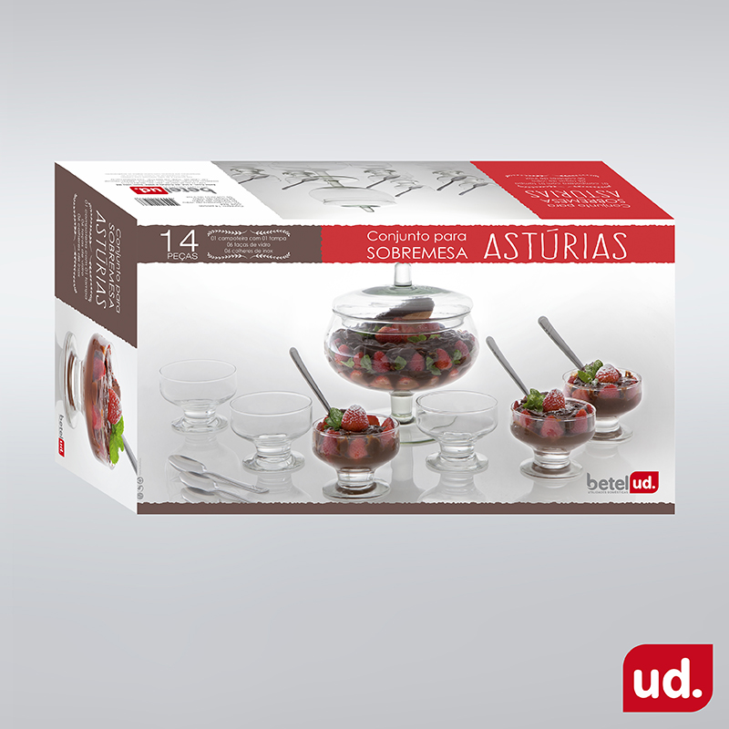 Cód. 844Contém 14 peças01 compoteira de vidro01 tampa de vidro06 taças de vidro06 colheres de inoxCaixa Master: 04
