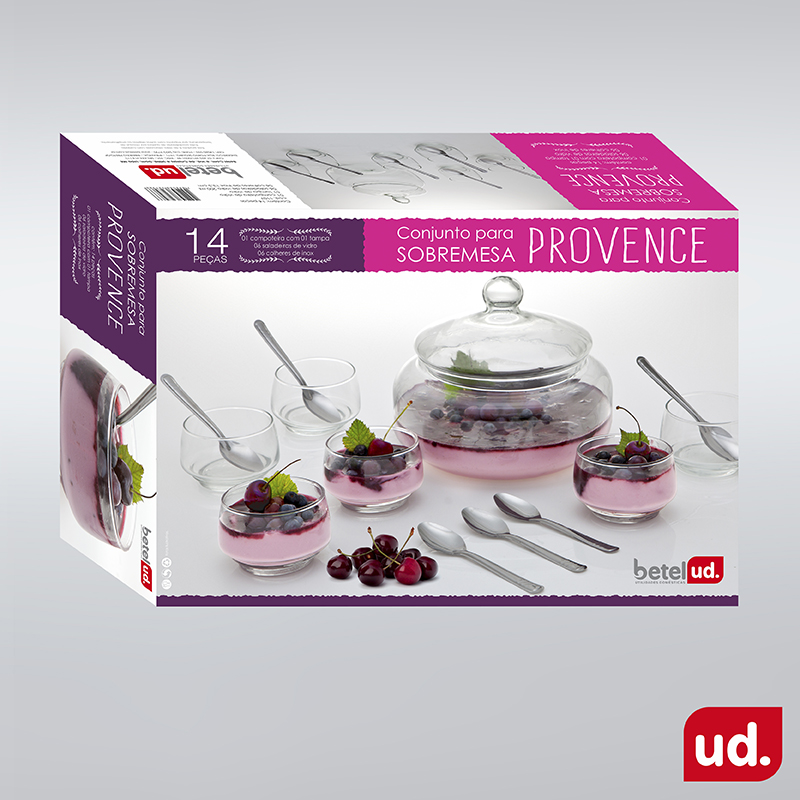 Cód. 1107Contém 14 peças01 compoteira de vidro01 tampa de vidro06 saladeiras de vidro 200ml06 colheres de inox 13,5cmCaixa Master: 04
